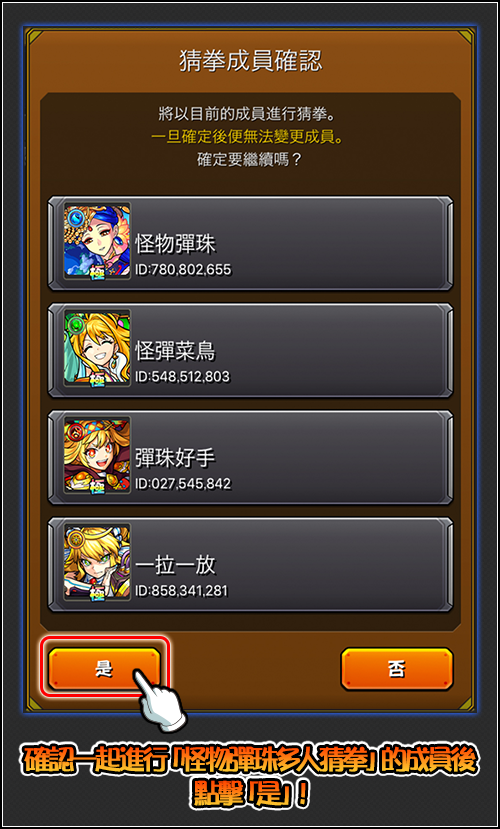 2)出發前於「確認成員」畫面確認隊友名單,沒問題的話再按下「是」就能夠一同猜拳了!