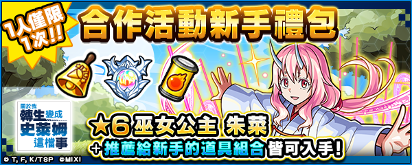 只要購買「關於我轉生變成史萊姆這檔事 合作活動新手禮包」,就能以運氣5&等級「極」&「+值」MAX狀態獲得只能透過合作活動新手禮包入手的「巫女公主 朱菜(★6)」(獸神化)!