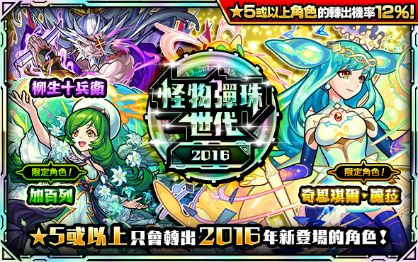 「怪物彈珠世代 2016」轉蛋活動中,假如★5或以上的角色轉出,必定是日本語版《怪物彈珠》中2016年初次登場的角色!