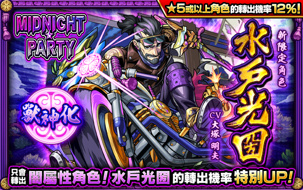 全新角色「水戶光圀」全新登場來到《怪物彈珠》的世界!不但如此,他初登場的這一次活動中,「水戶光圀」更會以出現機率特別UP角色之姿現身;假如轉出,強化「+」值將會是MAX(獸神化前)!