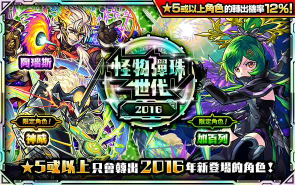 「怪物彈珠世代 2016」轉蛋活動中,假如★5或以上的角色轉出,必定是日本語版《怪物彈珠》中2016年初次登場的角色!